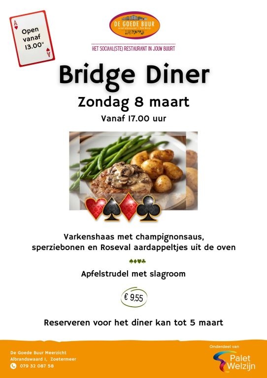 Gezellig een middag bridgen en samen genieten van lekker eten.