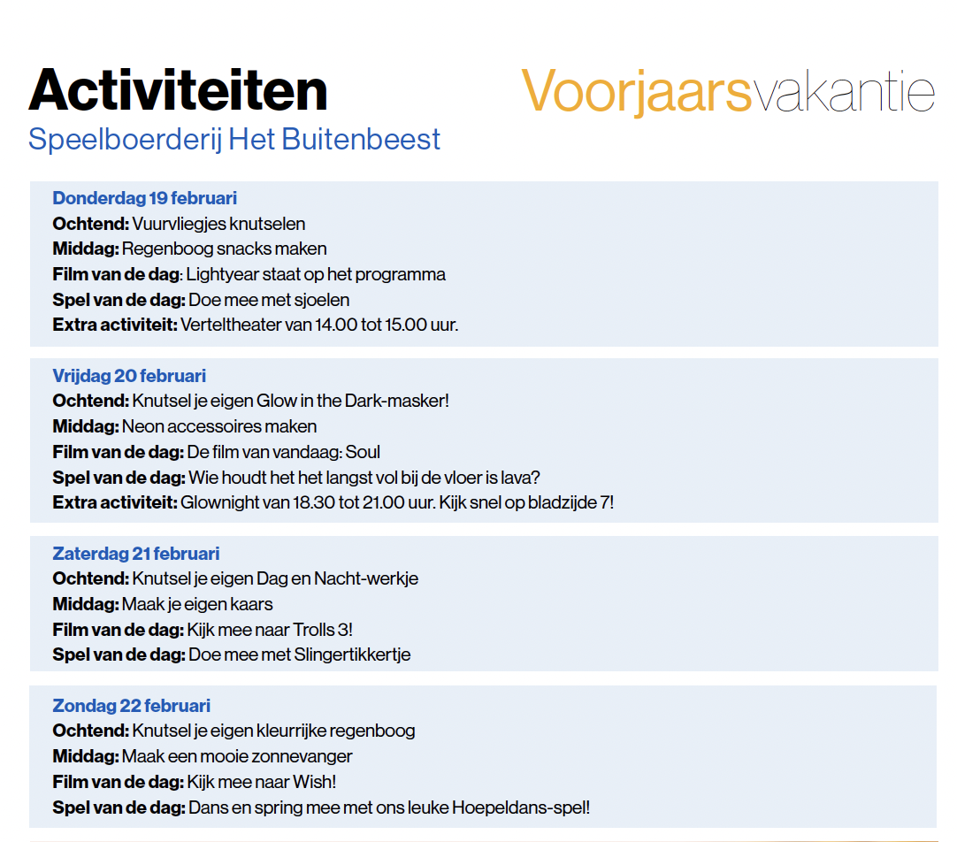 In de voorjaarsvakantie is er van alles te doen in Zoetermeer en in Meerzicht! Bij speelboerderij het Buitenbeest is het voor kinderen van 4 t/12 jaar elke dag een feestje. Bekijk hieronder wat er allemaal te doen is of loop even langs.