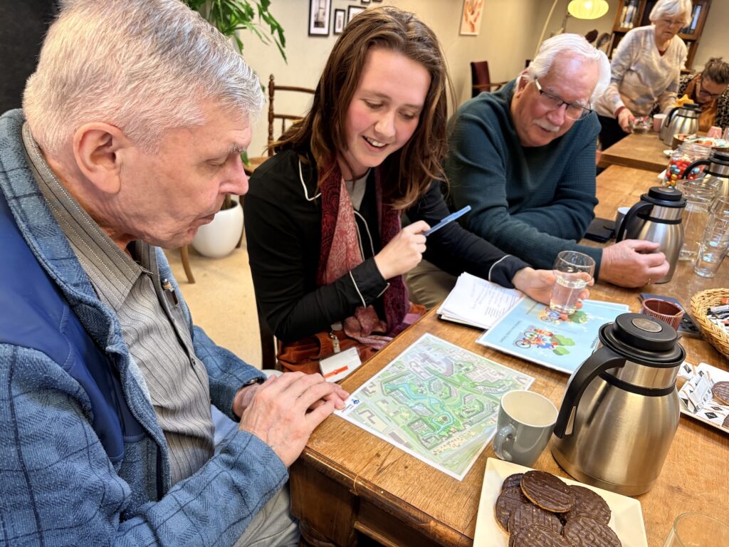 Bij de koffie- en theemiddag in de Oase was het gezellig. Aan de tafels werd in kleinere groepjes aan de hand van dilemma’sover het Bossenpark gesproken. Vooral de wens voor bankjes en goede geasfalteerde paden kwam naar boven. Fijn wandelen en kunnen genieten van het groen en water.