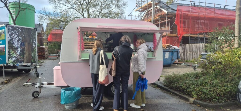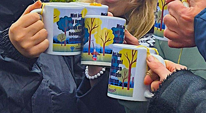 Ondanks de regen was de sfeer warm en enthousiast, na afloop genoten de harde werkers van koffie of thee bij de caravan van “Bij Daan” en ontvingen iedereen een mok als blijvende herinnering aan deze middag.