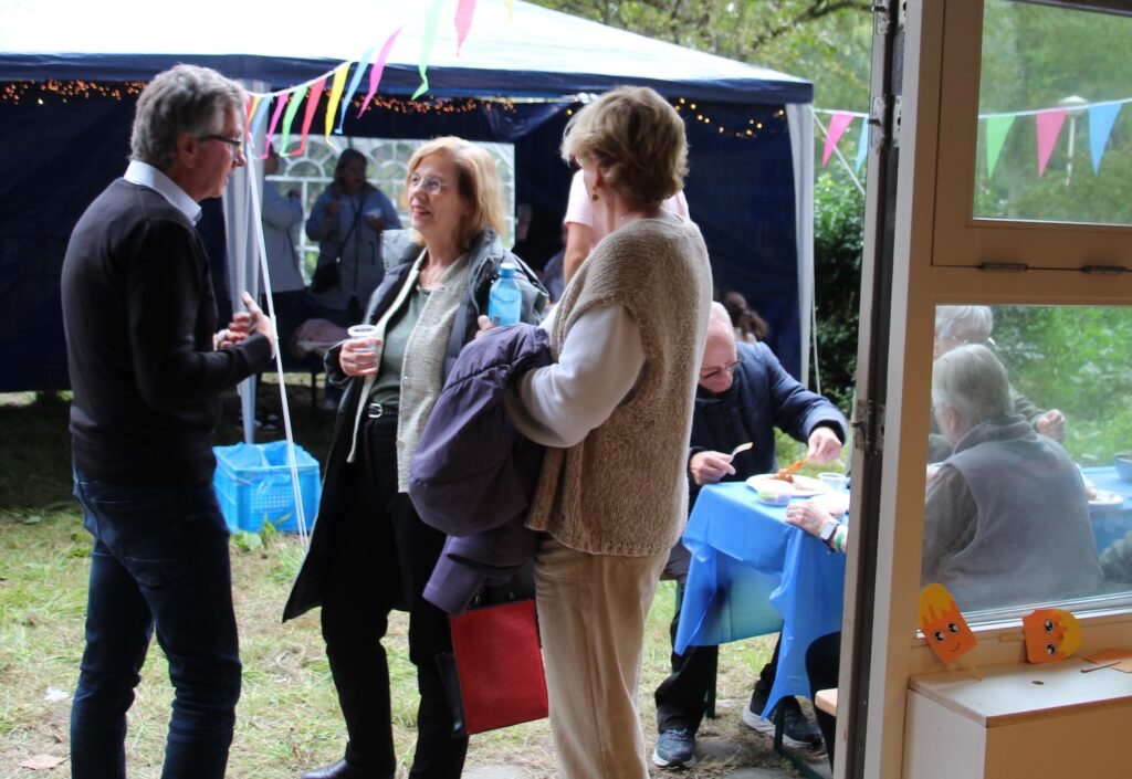 Binnen was het al snel gezellig: kinderen konden kleuren aan een speciaal ingerichte tafel, terwijl volwassenen elkaar troffen onder het genot van lekkernijen. Aan de achterzijde van de ontmoetingsruimte was het sfeervol aangekleed met partytenten, tafels en stoelen, en werd de barbecue in gereedheid gebracht.